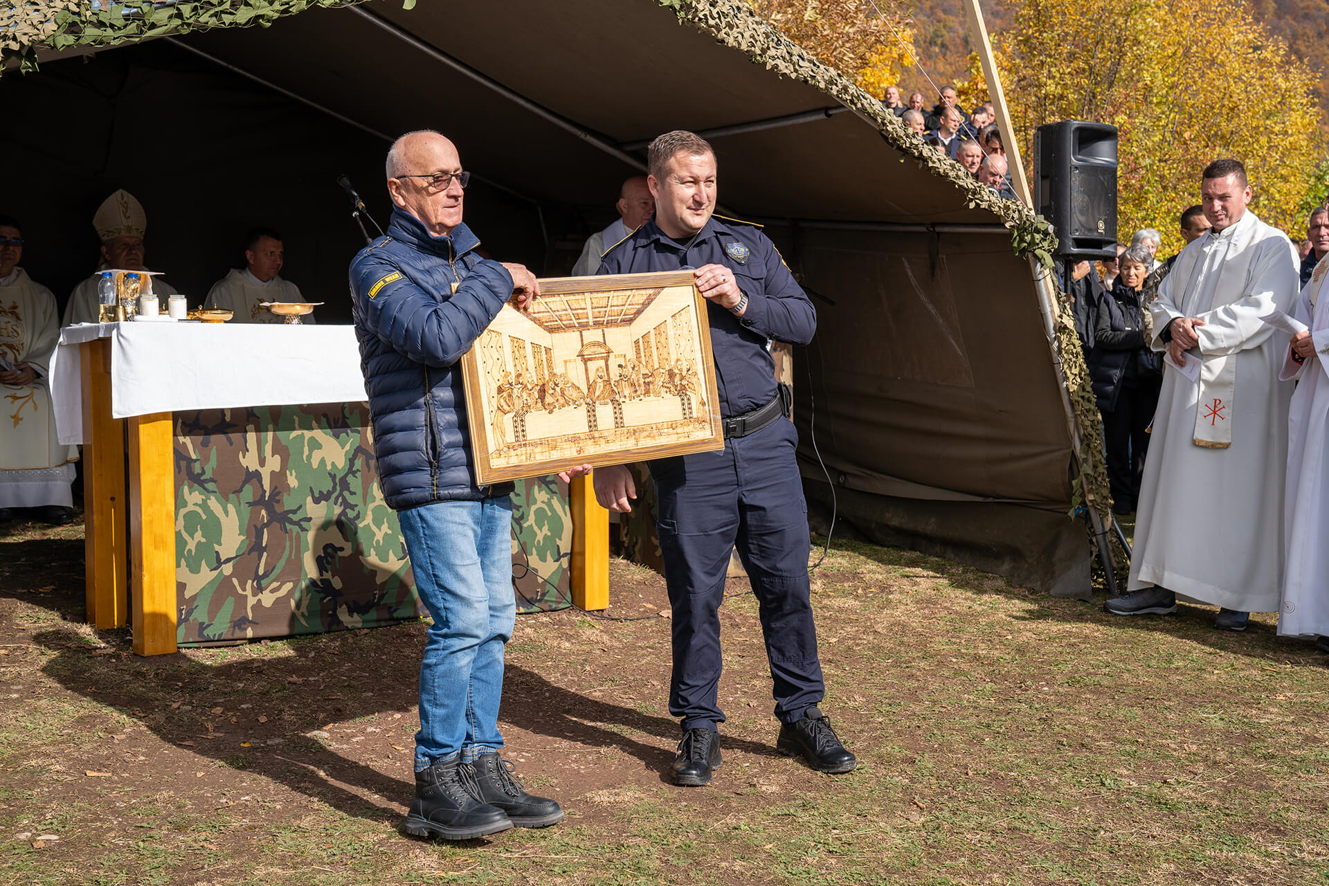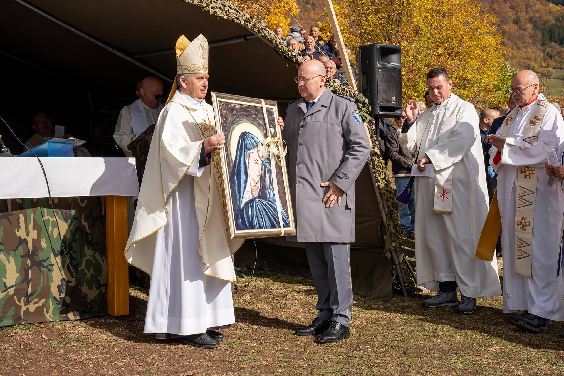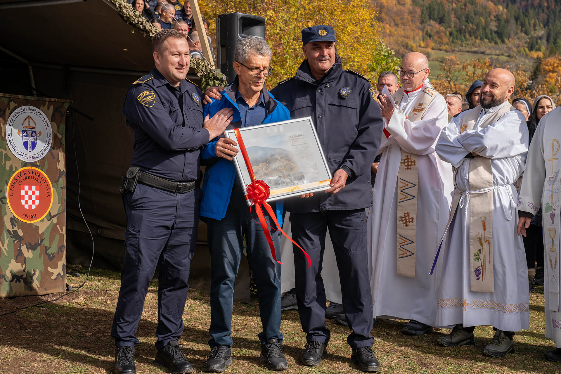 After that, the employees of the Border Police of Bosnia and Herzegovina presented an appropriate gift to Archbishop Vukšić. Also, and as is the tradition of the Day of Prayer in the royal city of Bobovac, the deputy director of the Zenica Penitentiary Ivica Dujmović presented a painting to Msgr. Jakovljević, and the commander of the guard of the Zenica Penitentiary presented a gift to the church choir of the parish of Vareš. Since Mr. Dujmović is retiring, his employees presented him with gifts for everything he has done.
