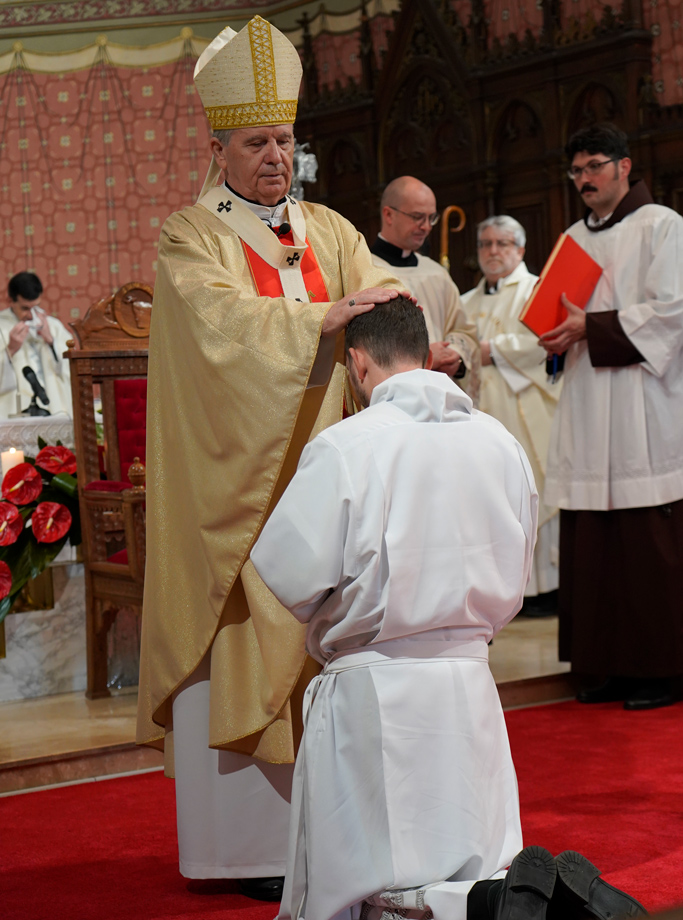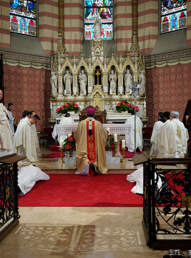Archbishop Tomo, through the laying on of hands and a consecration prayer, distributed the sacrament of the holy order of the diaconate to the candidates. Then, the newly ordained deacons, with the help of their pastors, donned their official liturgical vestments and at the end of the ceremony received the Evangeliary from the hands of the archbishop, exchanged the kiss of peace with him, and then began serving at the altar.
