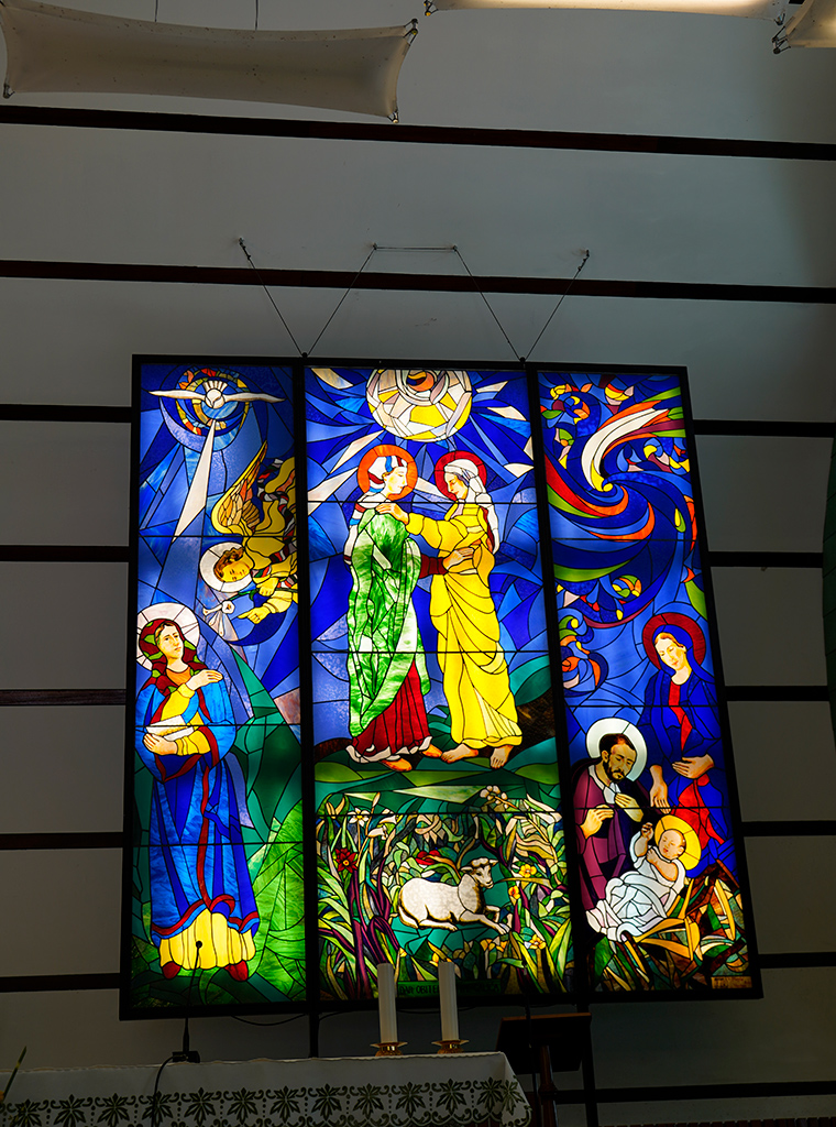 Interijer ovog modernog umjetničkog i duhovnog zdanja rese djela hrvatskog akademskog slikara Vladimira Meglića. „Ovdje iza mene vidite svojevrsni triptih u tiffany vitraj tehnici koji u svojem središtu prikazuje patron župe, a to je pohođenje Blažene Djevice Marije, susret Marije i Elizabete.