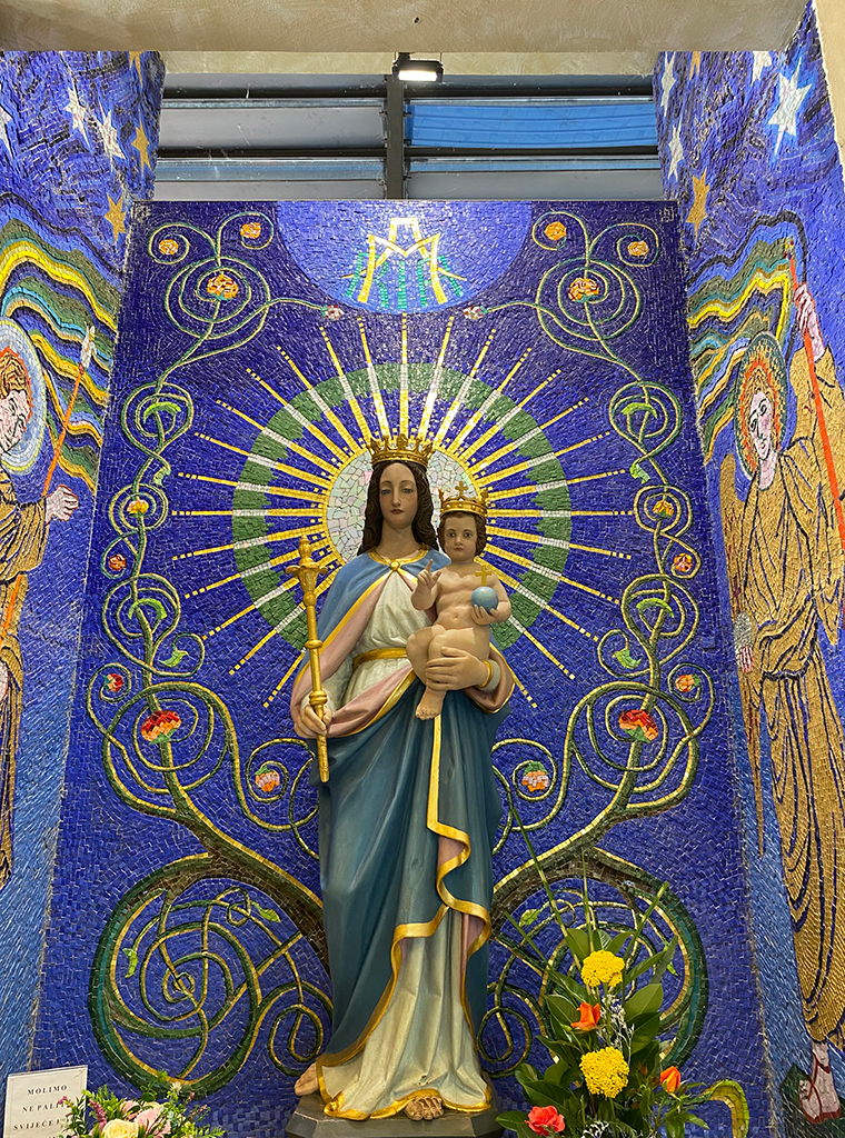 S lijeve strane je Navještenje, s desne je Isusovo rođenje, a ovi krasni mozaici uprizoruju marijanske blagdane koji su važni za ovo svetište – to je Mala Gospa, Velika Gospa i treća niša koja predstavlja dva anđela koji čuvaju Gospin kip.