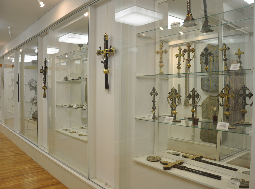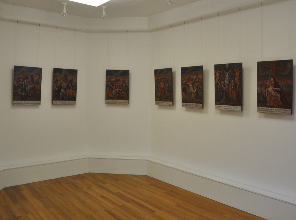 U ovom dijelu u kojemu se mi sad nalazimo izloženi su predmeti sakralnog karaktera koji su također podijeljeni u nekoliko cjelina – od liturgijskog posuđa gdje treba izdvojiti oltarne križeve, kadionice, bogatu kolekciju kaleža (kasnogotičkih, filigranskih, baroknih), zatim procesionalni križevi... Imamo kolekciju umjetničkih slika koje datiraju od 15. do početka 19. st., među njima su uglavnom djela talijanskih slikara. Treba izdvojiti i tri najstarije sačuvane slike u BiH koje su se u početku pripisivale jednom domaćem majstoru Stjepanu Dragojloviću, međutim kasnije su povjesničari umjetnosti utvrdili kako ih nije on naslikao (bio je samo naručitelj), nego Baldassare D'Anna. Riječ je o slikama Kristova raspeća, Naviještenja ili Blagovijesti te Bezgrješnog začeća Blažene Djevice Marije.