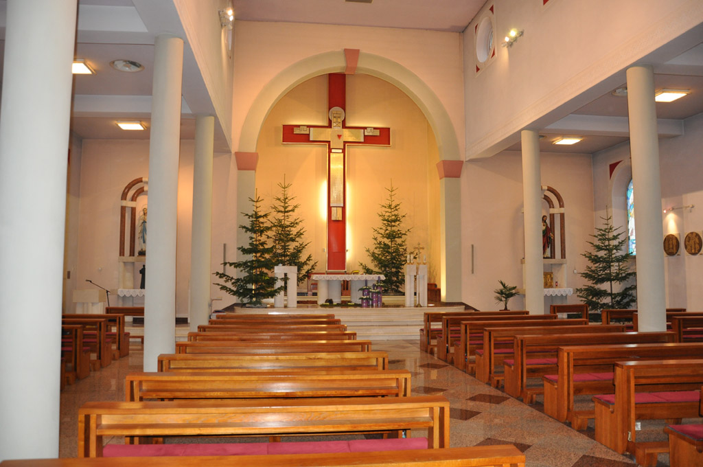 Potom smo, kako i običavamo, razgledali crkvu. Važno je napomenuti da se nakon formiranja župe 1906., misa slavila na tržnici u nadstrešnici Vaga. Prva crkva, veličine 10 x 5 metara, sagrađena je od ćerpiča 1908. U isto je vrijeme podignuta i župna kuća, koja je uklonjena 2004. Druga župna crkva izgrađena je 1936. godine. U Drugom svjetskom ratu crkva je dosta stradala i jedno vrijeme služila kao skladište partizanskim vlastima, a u kuću su se uselili stanari. Nova župna crkva završena je 1968., jer je stara bila premala za naraslu župu, pa su za vrijeme mise mnogi bili izvan crkve.