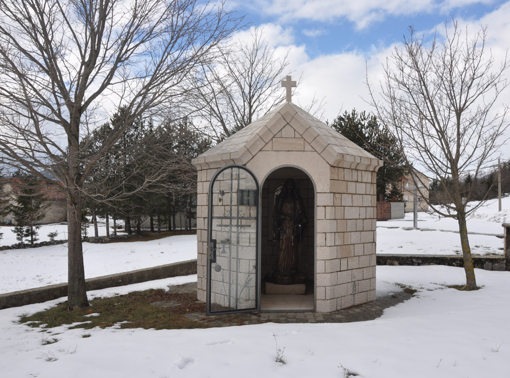 Potom smo malo obišli crkvu. Dvorište krije još jednu posebnost ove župe koju je fra Marinko zatekao kada je došao na službu. Riječ je o zavjetnoj kapelici, sličnoj desetinama drugih koje smo vidjeli na drugim župama. "Na kapelici piše da je za neoženjene i neudate. Ovo je radio moj predšasnik fra Šimun Romić. Je li to bila izvorna nakana samoukog i dobrog lokalnog umjetnika koji je župi darovao Gospin kip ne znam. Selom je pukao glas da ih se barem deset udalo nakon molitve Gospi ovdje. Tražio sam da mi se da barem jedno ime, ali svi su čuli od nekoga, ali konkretne osobe nema", ustvrdio je župnik i kroz smijeh naglasio da je ideja izuzetno zanimljiva, a ljudi dolaze i zagledaju pa čak i ako ne žele moliti na tu nakanu.