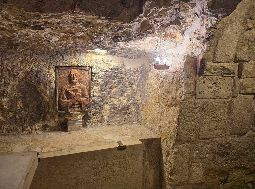 U ovoj je špilji Sv. Jeronim zajedno s većim krugom svojih suradnika i suradnica preveo Sveto pismo s grčkog i hebrejskog jezika na latinski, stvarajući Vulgatu, prijevod koji je stoljećima hranio vjeru Zapadne Crkve. Blizina mjesta Isusova rođenja dala je njegovu radu posebnu dubinu: Riječ koja je postala tijelom u Betlehemu, u Jeronimovim je rukama postala razumljiva i dostupna narodu.