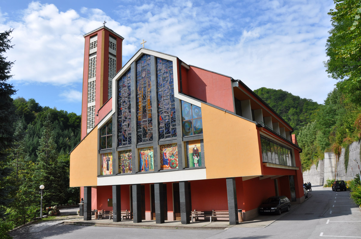 Prilazeći crkvi odmah smo zamijetili kip fra Grge Martića, bosanskog fratra koji je zadužio ovaj kraj, ali i čitavu Bosnu. Crkva ima upečatljivo pročelje na kojem je, kako smo kasnije saznali, 1974. Ivo Dulčić izveo pet tema u mozaiku: Sv. Katarina, Sv. Franjo Asiški, Sv. Leopold, Sv. Nikola Tavelić i Gospino krunjenje. Prema njegovu nacrtu naknadno je izveden i ogromni vitraj.