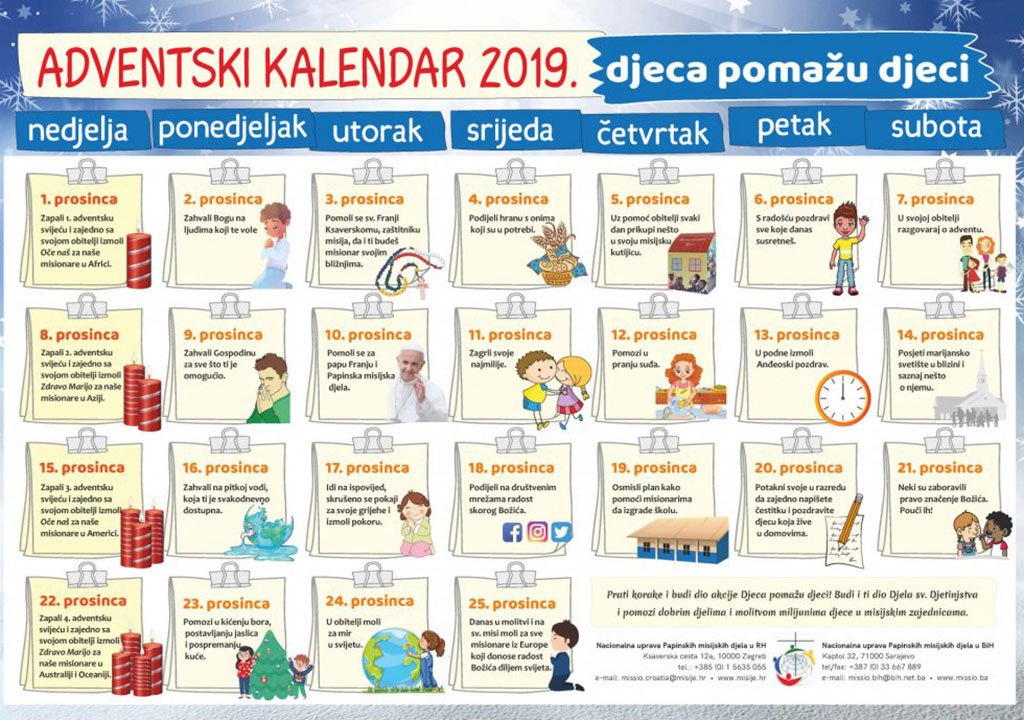 I ove godine mali misionari pripremat će se za Božić uz misijski adventski kalendar. Uz molitvu svakodnevno je predložena djelatna ljubav kroz zahvalnost, dijeljenje, pomoć, pozdrav i znanje. Kako bi djeca što bolje upoznala Tanzaniju u kojoj djeluje šest hrvatskih misionara i misionarki pripremljena je i karta Tanzanije sa zanimljivim činjenicama o toj zemlji.