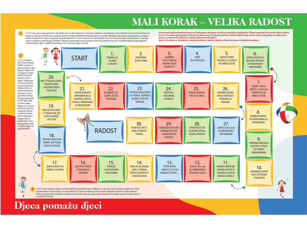 Mali korak – velika radost igra je kojom se djeci želi pokazati da se prava radost otkriva iznutra i kako nitko nije premalen da bi činio velike stvari. Iskrenom molitvom i dobrim djelom koje se učini od srca, događaju se velike stvari. Osim toga, svaki trud donosi malu pobjedu, a prvi je jednako dostojan poštovanja kao i posljednji.