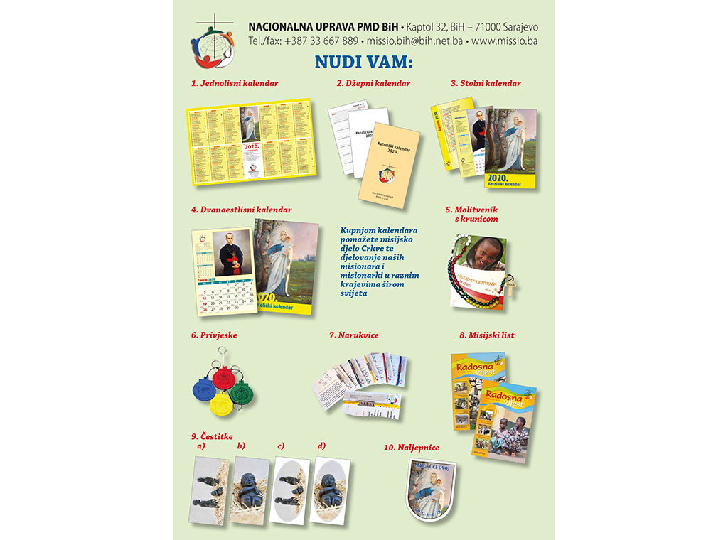 Uz kalendare i naljepnice za blagoslov obitelji, na promidžbenom letku s jedne strane je sve u slici što nudi Misijska središnjica (kalendari, krunice, privjesci, narukvice, RV, božićne čestitke i naljepnice), a s druge strane na poleđini su druge tiskovine, knjige i filmovi na CD-u o životu i djelovanju naših misionara, te narudžbenica i cjenik.