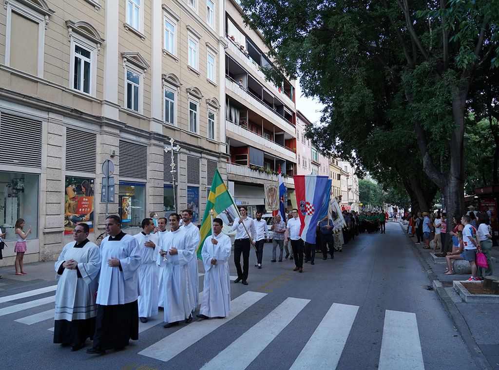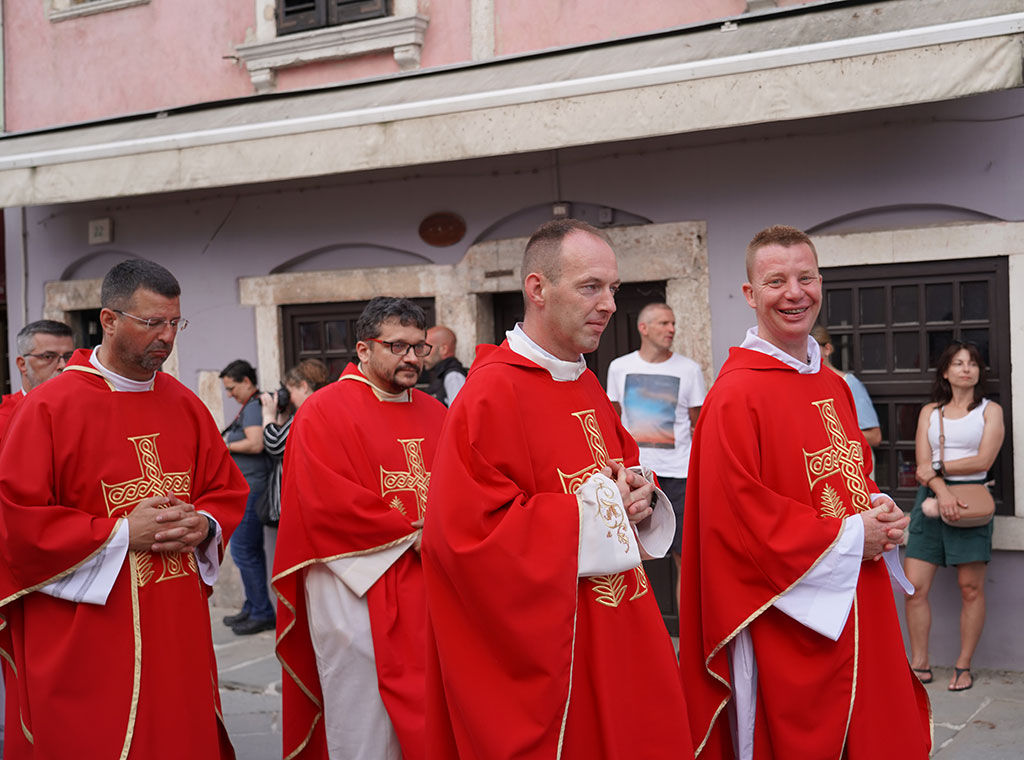 Brojnu procesijsku povorku uz križ, kadionicu i svijeće, činili su i nosači zastava župa koje su uveličale ovu proslavu, ministranti, Istrijani u svojim narodnim nošnjama, policajci, vatrogasci, mornari, predstavnici javnog života, misionarke i ostale nazočne redovnice, misionari i drugi koncelebranti te trojica biskupa i svečano odjeveni neumorni nosači kipa Sv. Tome koji su se smjenjivali tijekom procesije, a koje je pratio veliki broj vjernika pjevajući liturgijske pjesme.