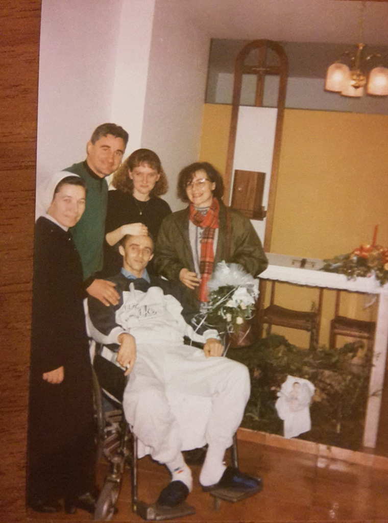 Tada je bolnički kapelan bio sadašnji krčki biskup Ivica Petanjak. Zvala sam ga: 'Dođi, vjenčat ćemo ga, to je tvoj Slavonac i donesi piće.' 'Ja ću donijeti čaše i kolače i ovo sve što treba', pa sam tako iz samostana ponijela čaše da to sve bude svečano. Napravili smo stol ispred sale, ispred intenzivne, pokrili ga zelenim stolnjacima… Nije to bilo kao u Slavoniji, ali je bilo lijepo. Kapelu smo lijepo okitili i onda smo njemu dali injekciju, teško je izdržao. Spustili smo ga u kapelicu koja je u podrumu. Došli su i liječnici i sestre, tko je god mogao. Bilo je svečano vjenčanje. Ivica je jako lijepu propovijed održao i rekao im je, između ostalog: 'Evo, sigurno ste planirali puno drugačije, uz slavonski kulen (...) Ali ovo je jedna posebna prilika koja će vam ostati u sjećanju.' I kada je vjenčanje skoro počelo, sjetim se novinara koji je prije ležao u šok sobi i zovem ga: 'Daj, molim te, dođi.' Veli mi kako je na terenu i pošalje druge. Kad ono stigle kamere“, prisjetila se s osmijehom misionarka Nikolić.