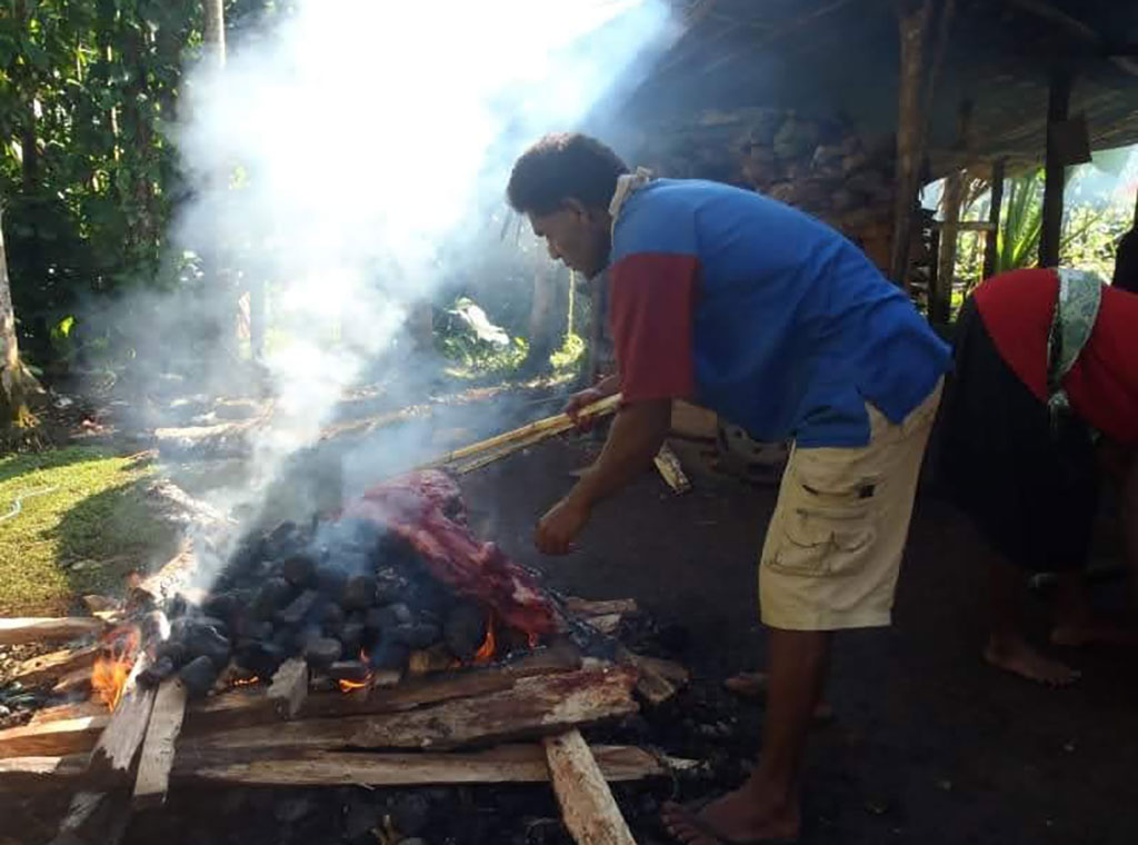 Na badnje jutro, već od ranog jutra, započinje se s pripremom božićnih jela. Cijelo selo je obavijeno dimom. Prikupljaju se drva i riječni kamen i slažu se za ognjište koje ispočetka jako dimi. Kad svo drvo izgori, ostaje vreli kamen u koji se slaže (zapreće) hrana pripremljena od zelja, taroa, kasavae, yama, krumpira, svinjetine... Sve se to posebno umotava u listove banane i potom slaže na vreli kamen prekriven taro listovima. Većina hrane se priprema u kokosovu mlijeku. Tu je i posebno pripremljen puding koji - kako objašnjava sestra – ne sliči na naš puding, nego je uglavnom slani prilog drugim jelima, od kasave ili tara s kokosovim mlijekom. Sve se to slaže na vreli kamen, pokriva listovima tare. To je povrće s velikim listovima i plodom ispod zemlje koji mogu biti veličine krumpira do manje tikve, ovisi o vrsti tara. Sva hrana pečena u kamenju jako je ukusna. Spomenula nam je i kako će većina obitelji siječanj prepostiti jer u tjednu od Božića do Nove godine spremaju sve što imaju...