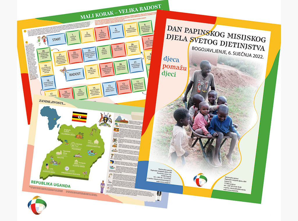 Mons. Luka Tunjić, nacionalni ravnatelj PMD-a BiH u svom dopisu, poslanom uz materijale, napominje kako usprkos svim poteškoćama koje stvara pandemija koronavirusa, u suradnji s Nacionalnom upravom PMD-a Hrvatske i ove godine su pripremljeni animacijski materijali koji će tijekom došašća pomoći u pripravi djece za Božić i Bogojavljenje, kada se obilježava i Dan djela svetog djetinjstva. „Brošura je bogata raznovrsnim sadržajima, vrlo poticajna i može pomoći svima koji rade s djecom. Ove godine je predstavljena Uganda u kojoj djeluje šest naših misionara i misionarki. Dosadašnji adventski kalendar je malo modificiran i pretvoren u igru za djecu kao i za cijelu obitelj. Može se igrati tijekom cijele godine i više je od igre jer potiče i razvija zajedništvo, radost i osjećaj pobjede, ali i kako podnositi poraz. Simboličnog je naziva: Mali korak – velika radost. Uvjereni smo da će polučiti očekivane rezultate i interes“, naznačio je mons. Tunjić, a igra se po simboličnoj cijeni može naručiti na mail: misije.bih@gmail.com; missio.bih@bih.net.ba i telefon: 033/667 889.