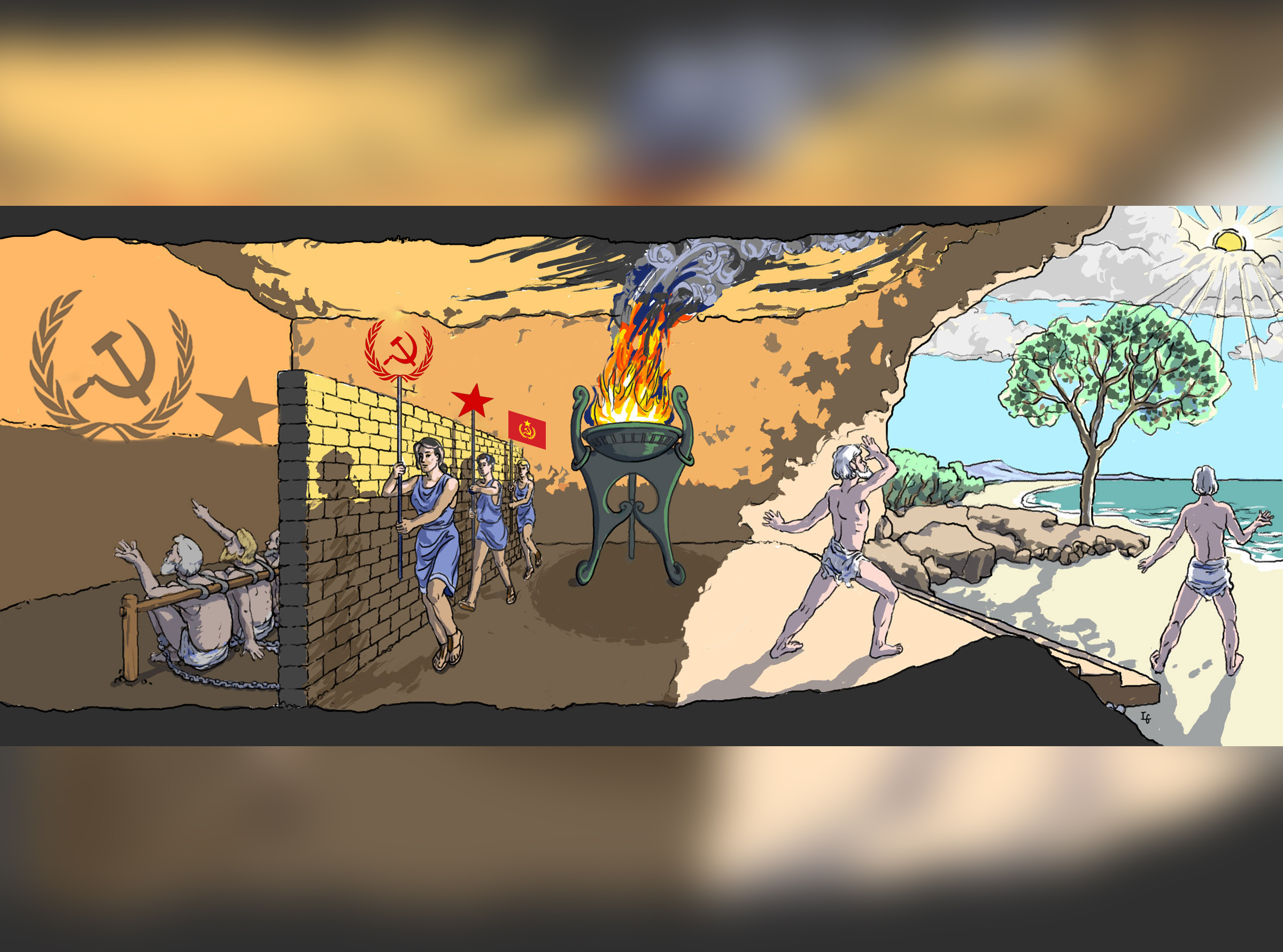 O kakvoj je opasnoj indoktrinaciji riječ može se shvatiti i iz Platonove priče o ljudima iz spilje. Jedna je grupa ljudi od djetinjstva bila zarobljena u spilji, tako vezana da se nije mogla osvrnuti nazad. Na osvjetljenom zidu ispred sebe vidjela je samo sjene onoga što se događa iza njih. Sjene su za njih postale istinom.