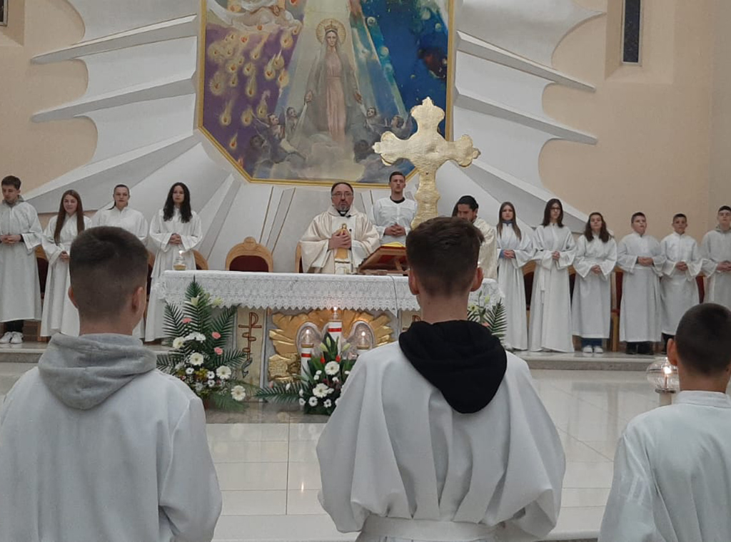 Svećenik: Pomolimo se. Gospodine Isuse Kriste, pogledaj na ovu djecu naše župne zajednice koja danas stoje pred Tobom svečano obučena u odjeću Tvoje službe. Molimo Te, daj im snage da ostanu vjerni ovoj službi koju su sada s oduševljenjem prihvatili.