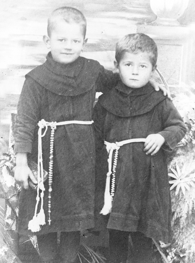 Dva dječaka odjevena u odijelo trećeg reda sv. Franje. Fotografija nastala početkom 20. stoljeća.