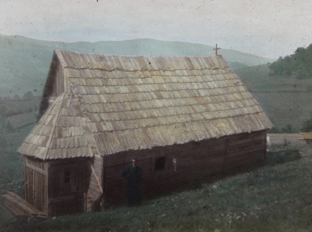 Ispred barake stoji župnik Franjo Kovačević rođen u Travniku 1880. Župa je godine 1910. imala 840 katolika.