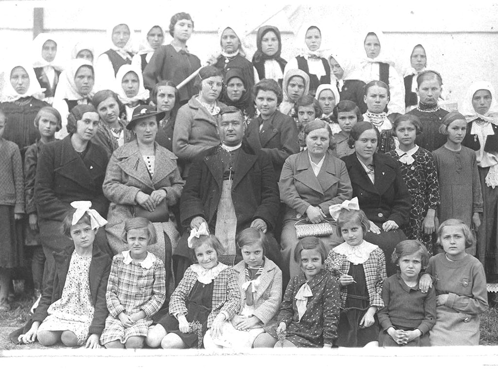 Fotografija načinjena pred Drugi svjetski rat. Župnik vlč. Jakov Barišić s križaricama župe Gradačac.