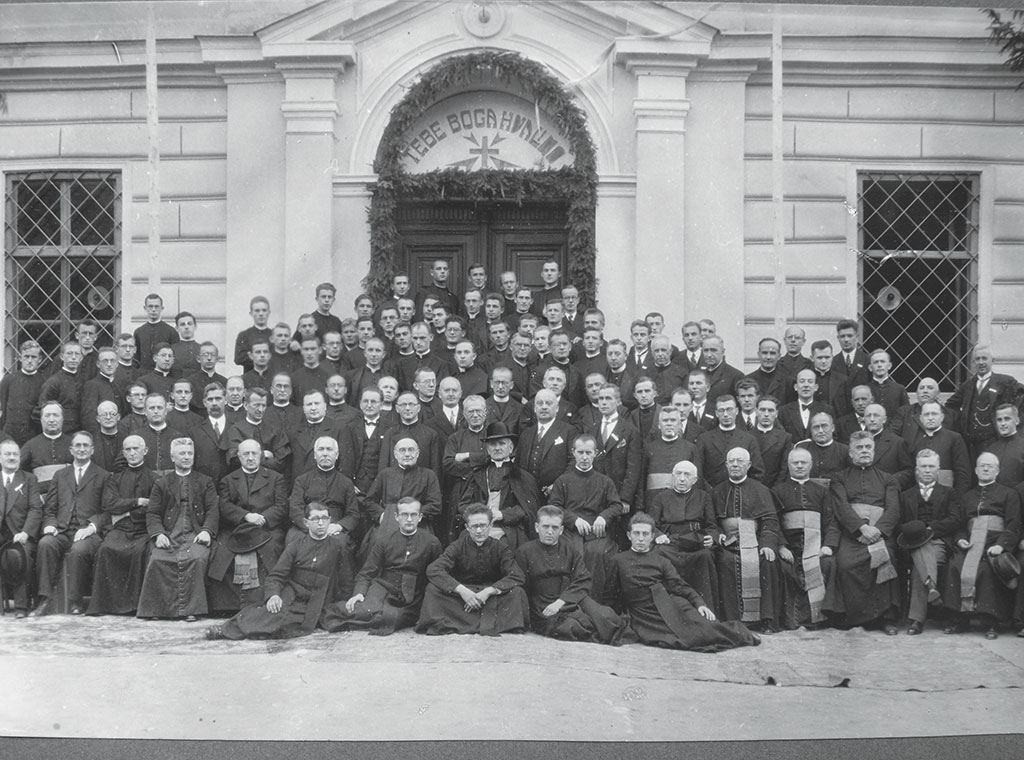 Na fotografiji se nalaze nadbiskup Ivan Šarić zajedno sa svećenicima i bogoslovima prigodom obilježavanja 50 godina sjemeništa u Travniku 9. listopada 1932.