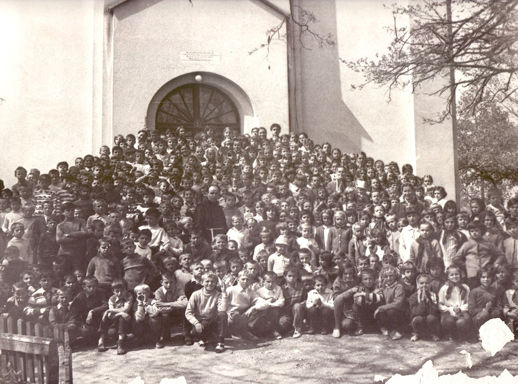 Župa svetog Ilije u Novom Šeheru, nadomak Žepča. Na fotografiji snimljenoj 1970. su župnik fra Gabrijel Tomić i djeca iz župe.