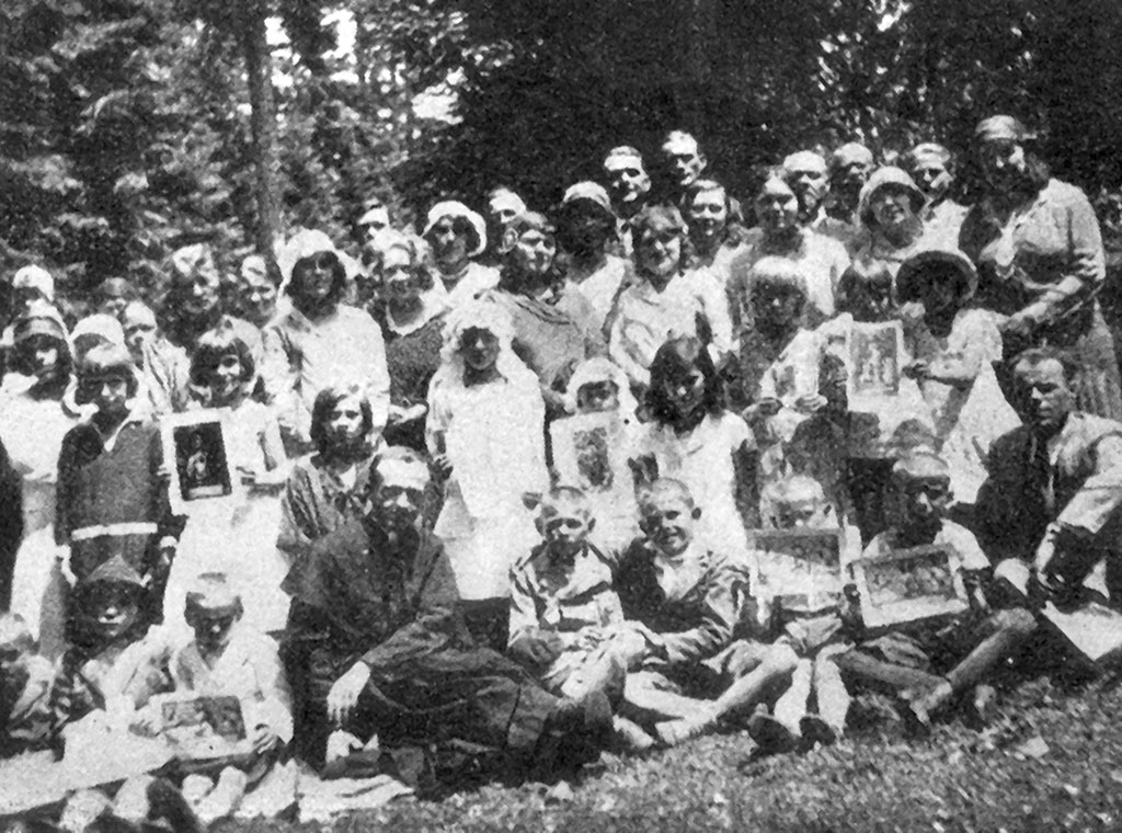 Na fotografiji roditelji s djecom prvopričesnicima godine 1933. Bilo je desetak prvopričesnika.