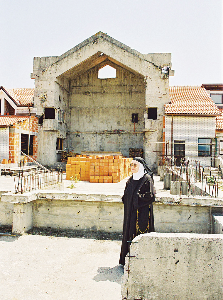 Sestra karmelićanka na Stupu – Sarajevo, godine 2002. Sestra stoji ispred započete crkve (i djelomično obnovljenog samostana) – oštećene ratnim događanjima u Bosni i Hercegovini (1992. - ’95.).