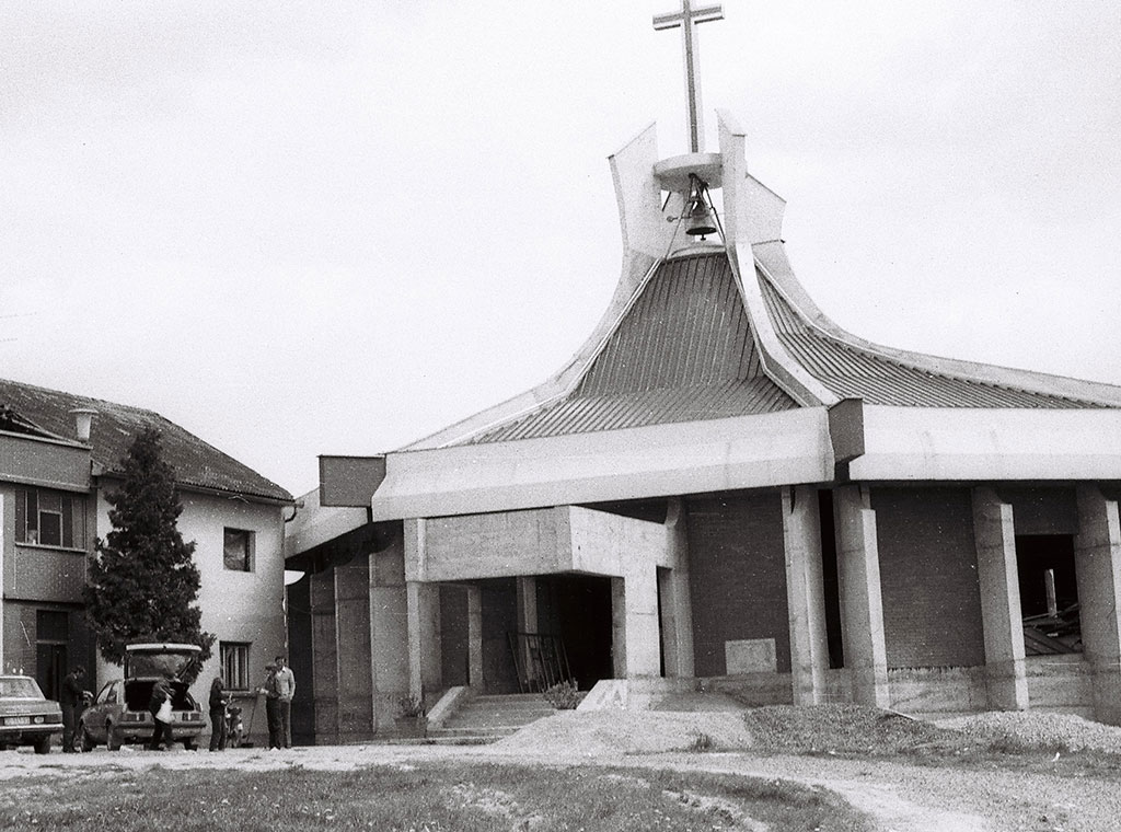 Fotografija je nastala 1984./'85. kad su već završeni grubi radovi i postavljeni krov i zvono.
