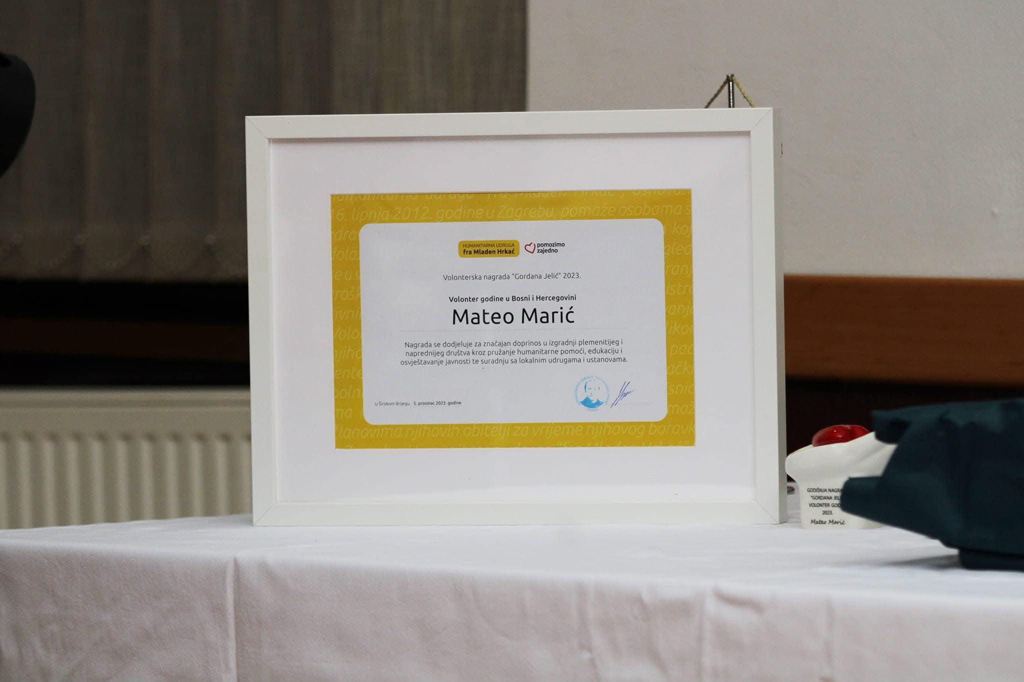 Svečanu nagradu volonteru godine uručio je predsjednik udruge fra Mladen Hrkać Ivan Soldo, koji se zahvalio svim okupljenima te ohrabrio Matea, kao i druge da srcem i dušom volontiraju za dobrog ovog svijeta.