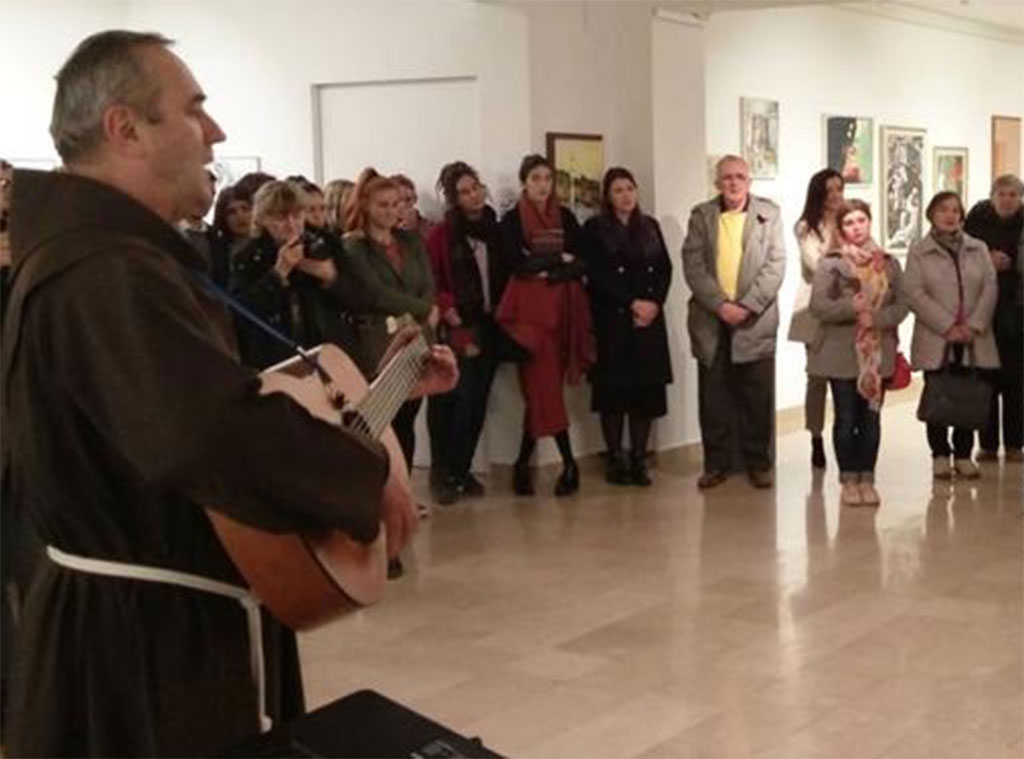 Više od 70 djela umjetnici su darovali Franjevačkom međunarodnom centru za dijalog, mir i pomirenje, a likovna ostvarenja izložena su u Širokom Brijegu od 14. do 31. ožujka. Izložbu je otvorio gvardijan širokobriješkog franjevačkog samostana fra Tomislav Puljić, a ovom postavu govorili su umjetnica Kristina Lončar i dr. Josip Mijić. Događaju su bili nazočni vjernici iz Srednjeg Podrinja i njihov župnik Zvonika i Srebrenice fra Joso Oršolić.
