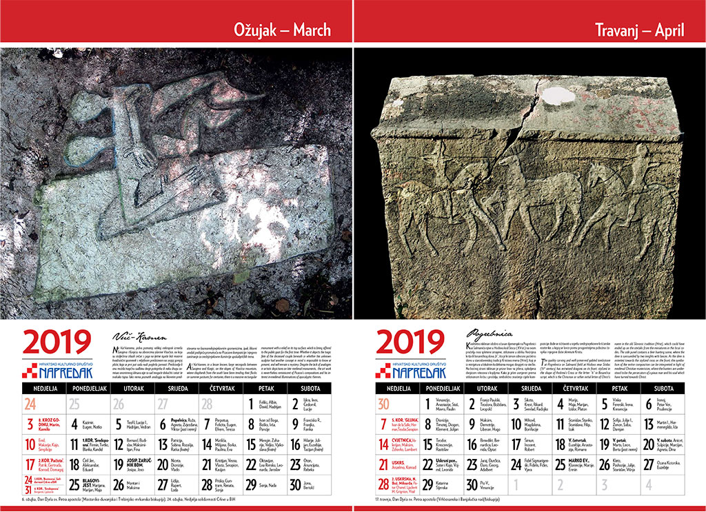 Stranicom za siječanj započinje imaginarno putovanje u svijet stećaka koje nas vodi u Bistrinu (kod Stona) gdje vidimo stećak čijom plohom dominira reljefni križ, uz srednjovjekovne motive dobra i zla.