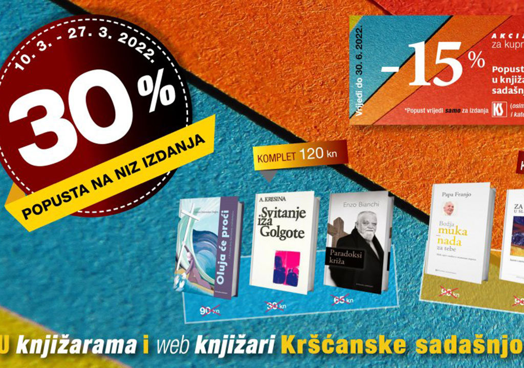 Na korizmenom putu, svake godine novom i predanom, može nas pratiti i dobra knjiga. Kršćanska sadašnjost pokrenula je stoga veliku akciju koja uključuje popust od 30 % na niz naslova, od knjižica križnoga puta do dubokih duhovnih, teoloških promišljanja o Kristovoj muci i uskrsnuću. Popust od 30 % na izabrane naslove vrijedi i u knjižarama Kršćanske sadašnjosti i u web knjižari, a za svaku kupnju iznad 200 kuna kupcima u knjižarama darujemo kupon s 15 % popusta na iduću kupnju izdanja Kršćanske sadašnjosti (osim periodike, liturgijskih i katehetskih izdanja).