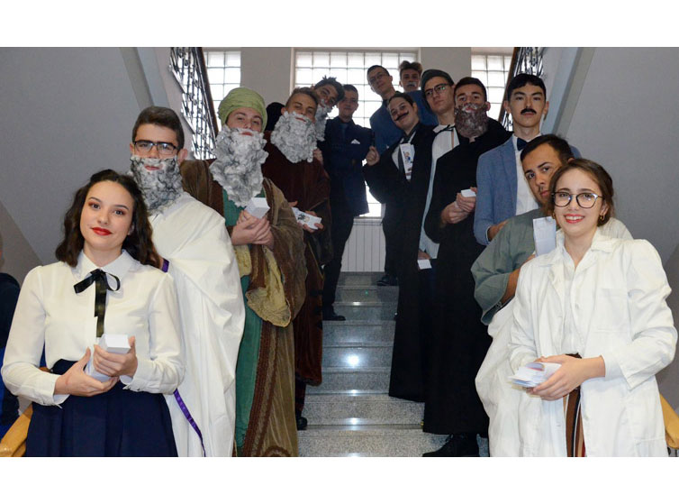 U prvom dijelu izložbe hodnicima škole prošetalo je 14 svjetskih znanstvenika od Alberta Einsteina, Arhimeda, Alhazena, Gauss, Ktesibija, Fausta Vrančića, Nikole Tesle, do Le Corbusiera, Maxa Schelera, Galilea, Wladimira, Koeppena, Rosalinda Franklina, Slavoljuba Penkala i Hedy Lamar. To je bilo popraćeno električnom gitarom, violinom, glasovirom i dvjema klapskim izvedbama.