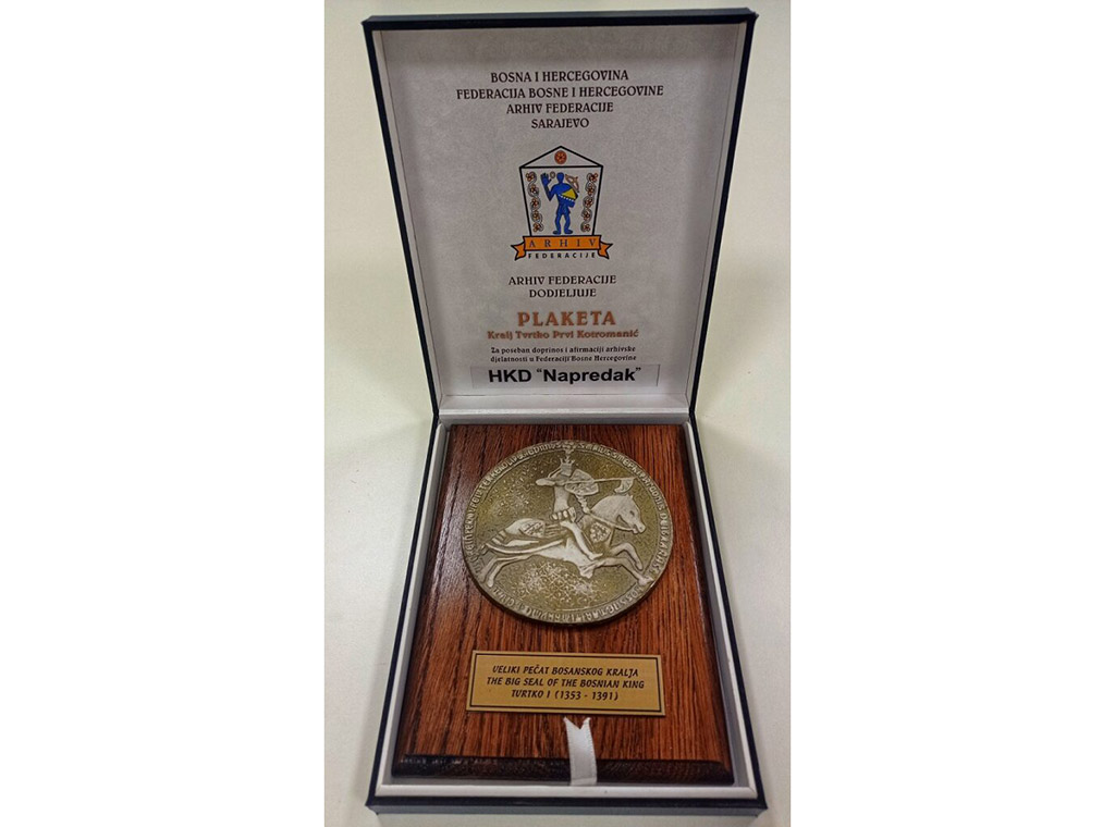 Plaketa Kralj Tvrtko Prvi Kotromanić u 2022., među ostalim, dodijeljena je i nacionalnim kulturnim društvima: Židovskom kulturno–prosvjetnom i humanitarnom društvu La Benevolencija, Srpskom prosvjetnom i kulturnom društvu Prosvjeta, Hrvatskom kulturnom društvu Napredak i Bošnjačkoj zajednici kulture Preporod, izvijestili su na hkdnapredak.com.