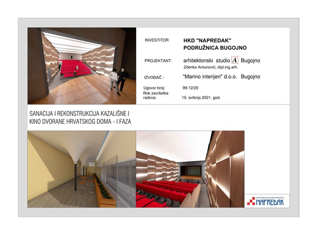 Godinama planirana rekonstrukcija kazališne-kino dvorane u zgradi Hrvatskog doma u Bugojnu započela je još 2019., u lipnju 2020. je prihvaćen idejni projekt Arhitektonskog studia A iz Bugojna, a sada bi prva faza rekonstrukcije trebala biti gotova do sredine svibnja.