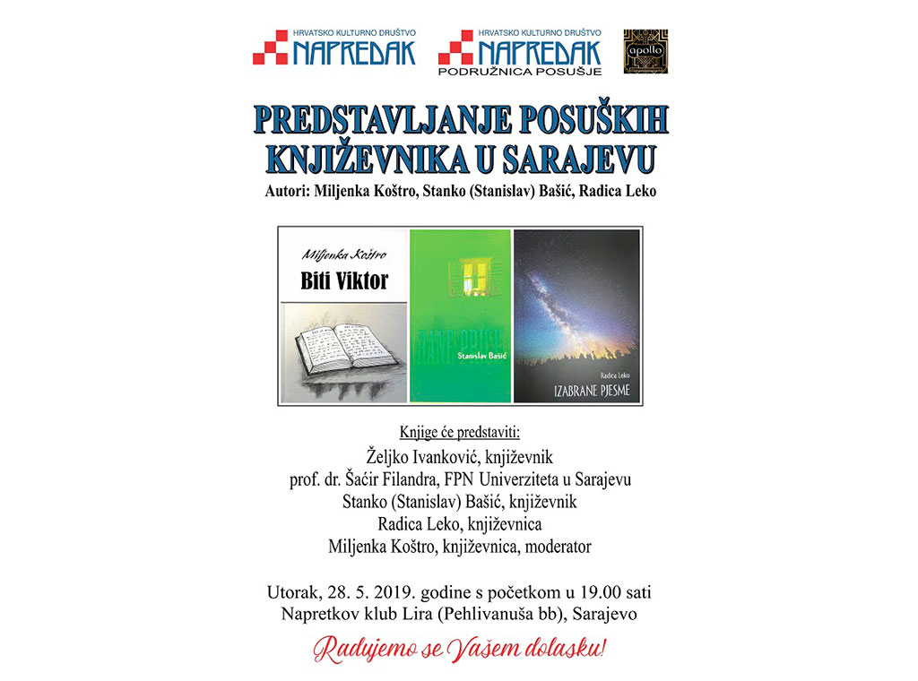 Hrvatsko kulturno društvo „Napredak“, HKD Napredak podružnica Posušje i Udruga za promociju kulture „Apollo“ iz Posušja organiziraju predstavljanje djela posuških književnika u Sarajevu 28. svibnja u 19 sati.