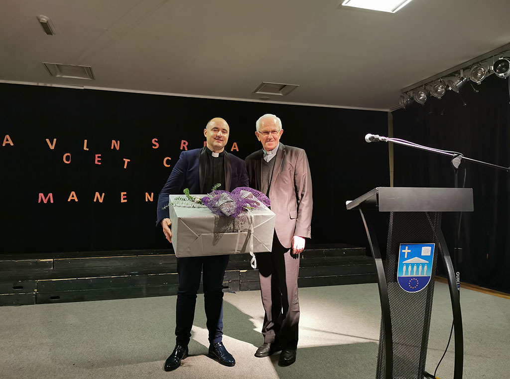 U ime djelatnika Sustava katoličkih škola za Europu, nakon gromoglasnoga dugog pljeska, biskupu Peri, prigodni je dar uručio ravnatelj Vlatko Rosić.