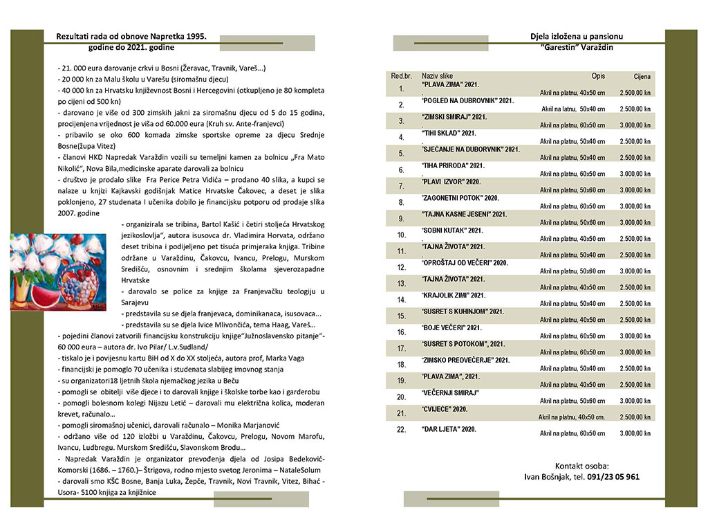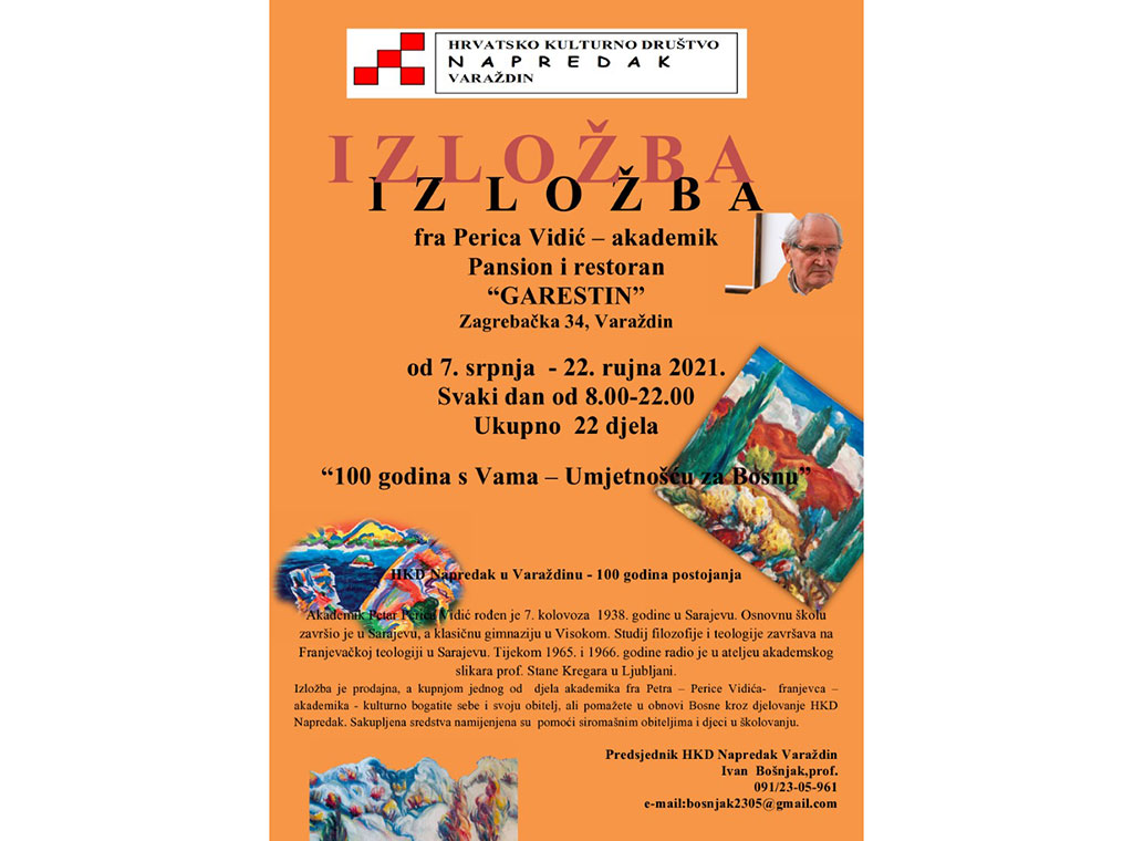 Hrvatsko kulturno društvo „Napredak“ iz Varaždina organizira prodajnu izložbu sliku akademskog slikara fra Petra Perice Vidića.