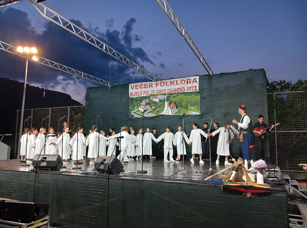 Tako je prve večeri trodnevnice, nakon pobožnosti i svete mise, priređena i smotra folklora u župnom dvorištu. Između ostalih nastupilo je i novoosnovano Društvo iz Mostara. Nastup je bio odličan, a maleni su izazvali silne simpatije kod prisutnog mnoštva.