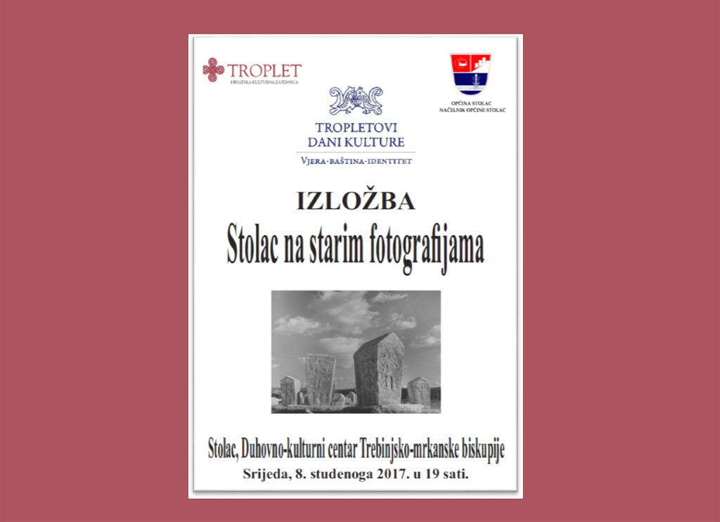 Bit će postavljena u galeriji Duhovno-kulturnoga centra Trebinjske biskupije u Stocu, a svečano otvorenje održat će se u srijedu, 8. studenoga u 19 sati. „Pozivamo sve Stočane ali i ostale ljubitelje kulturne baštine na zajedničko slavlje ljepote ovoga grada i kraja“, istaknuli su iz Tropleta. Prema najavi, izložba će prikazati nekoliko desetaka umjetničkih fotozapisa stolačkoga kraja i ljudi iz prošloga stoljeća.