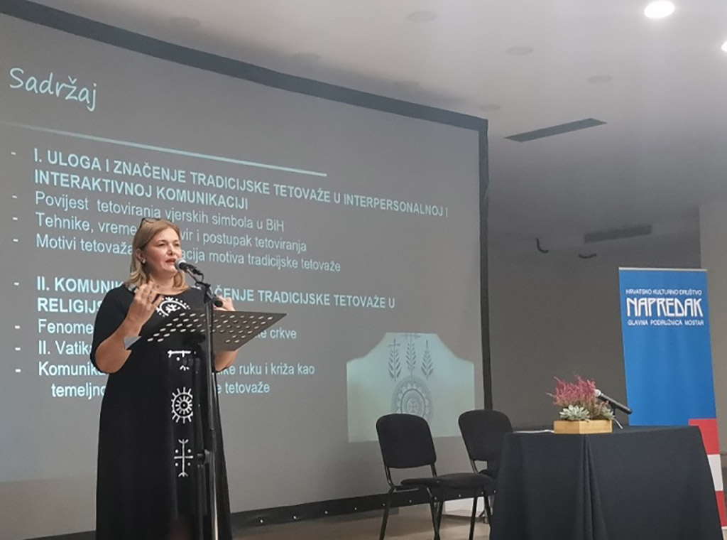 Predavanje, na kojem je prezentirana povijest i simbolika tradicionalnog tetoviranja žena katolkinja u BiH, održala je dr. Vesna Haluga, koja je 2022. obranila doktorsku disertaciju na temu Semiotički aspekti i suvremeno komunikacijsko značenje tradicijske tetovaže žena katolkinja iz BiH. "Ovo je neka identitetska priča, a mislim da je ovo ujedno i jako lijepa i jako teška priča, posebno u onih 400 godina od njezinog nastanka. Što se tiče suvremenog, tetovaže u posljednjih nekoliko godina postaje popularna. Tradicijska tetovaža žena katolkinja se jako dobro uklapa u kulturnom, povijesnom, etnološkom, sociološkom, ali i u suvremenom kontekstu", kazala je Haluga.