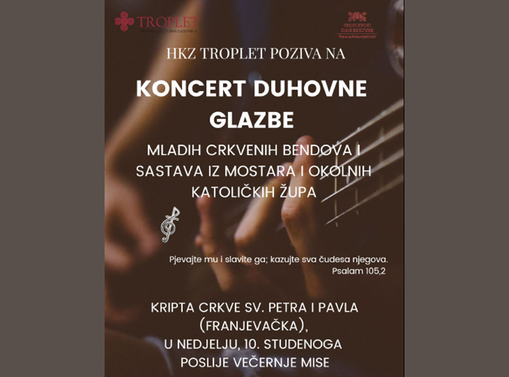 U nedjelju, 10. studenog u 19 sati, poslije večernje svete mise, u kripti župne crkve Sv. Petra i Pavla u Mostaru, u sklopu "Tropletovih dana kulture 2019" bit će uprilčen koncert duhovne glazbe.