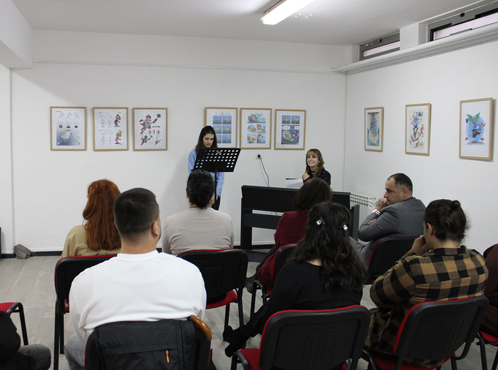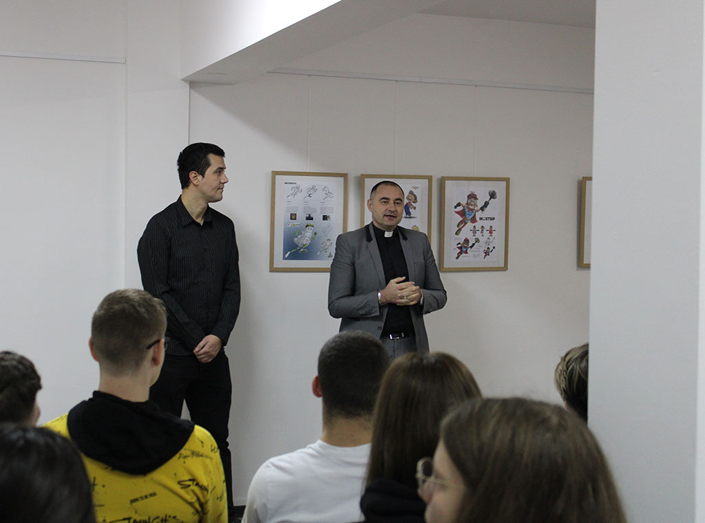 Autor Cvjetković je govorio o karakter dizajnu i stripu, a na poseban način je objasnio što je želio postići ilustracijom škole. „Gledajući ovu školu na fotografijama iz zraka mi se učinilo kao da su krovovi poput otvorene knjige, ne znam je li to bila zamisao arhitekte ili je slučajno izašlo tako, ali mi se učinilo zanimljivim taj moment uvrstiti u ovu ilustraciju škole kao odgojno-obrazovne ustanove“, istaknuo je mladi umjetnik u svom obraćanju.
