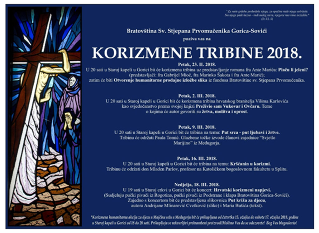 Bratovština Sv. Stjepana Prvomučenika Gorica-Sovići u Gorici kod Gruda tijekom korizme nastavlja s organizacijom tribina.