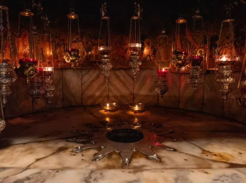 Srebrna zvijezda koja označava mjesto gdje je Isus rođen, u Spilji rođenja, unutar Bazilike rođenja u Betlehemu