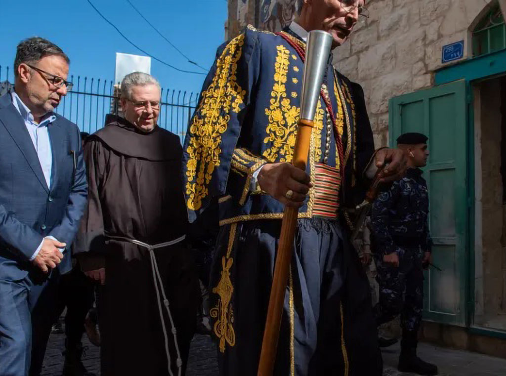 Kustos Svete zemlje otac Francis Patton ide Zvjezdanom ulicom u Betlehemu tijekom svog svečanog ulaska 2. prosinca, na početku došašća. Ispred njega je jedan od Kawa koji služi Kustodiju Svete zemlje