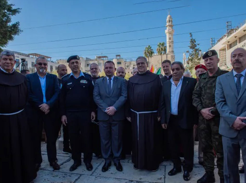 Kustosa Svete zemlje, fra Francesca (u sredini), dočekali su gradonačelnik, guverner, načelnik policije i vojni zapovjednik - kada je stigao na Trg jaslica u Betlehemu