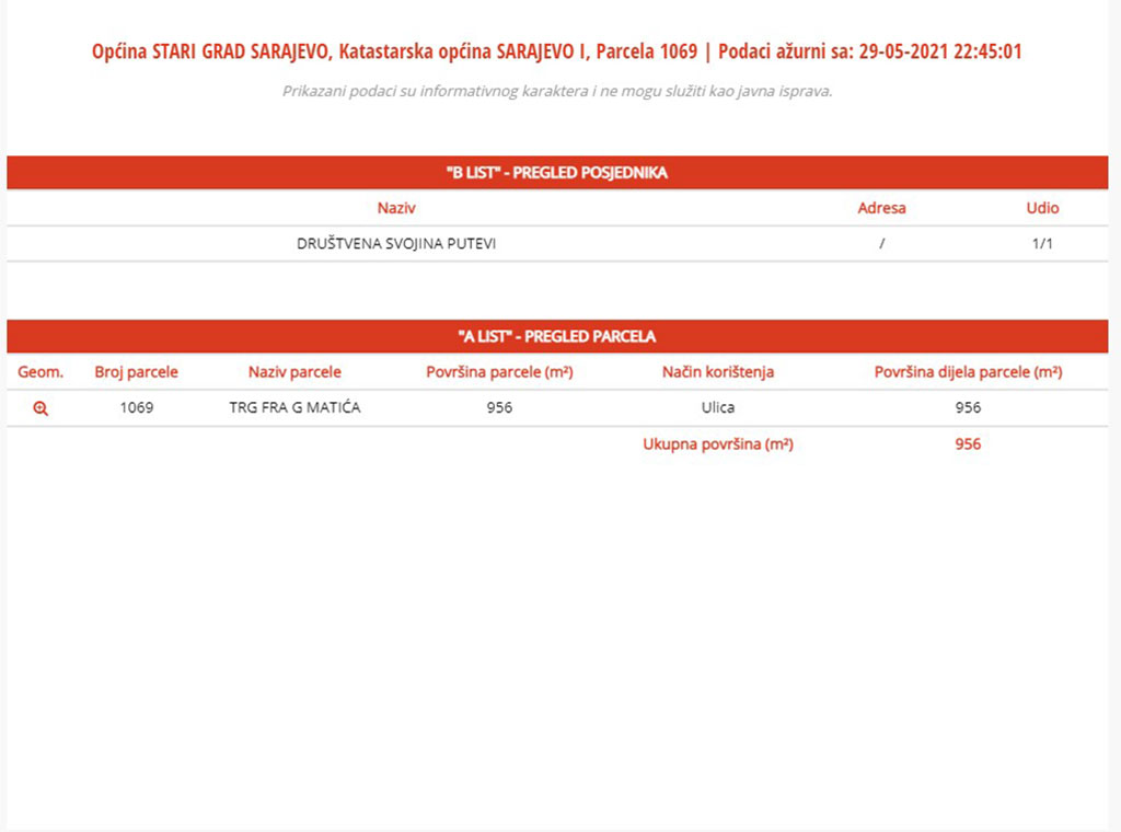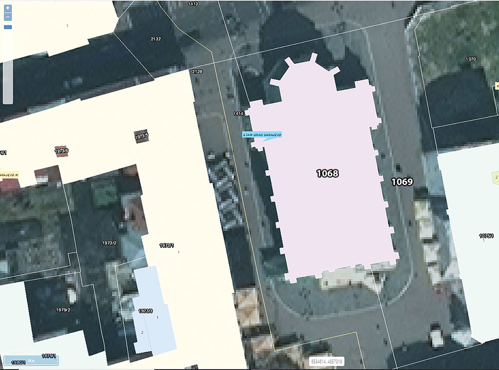 Za to smo se poslužili alatom „Pregled“ raspoloživim na službenoj stranici Federalne uprave za geodetske i imovinsko-pravne poslove (katastar.ba) gdje je potrebno upisati općinu (Stari Grad Sarajevo), katastarsku općinu (Sarajevo I), i broj katastarske parcele (u ovom slučaju 1 068) ili posjedovnog lista. Potom se na mapi grada određenom bojom prikaže tražena nekretnina/ površina (fotografija br. 1) i samo ono što je prikazano tom bojom potpada pod navedenu katastarsku parcelu/česticu.