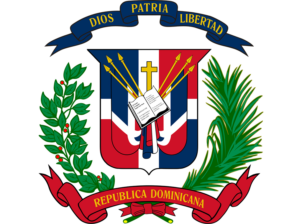 Na vrhu grba nalazi se plava vrpca s natpisom: Dios, Patria y Libertad (Bog, domovina i sloboda), dok se u podnožju nalazi crvena vrpca s natpisom República Dominicana, usmjerena prema gore.“