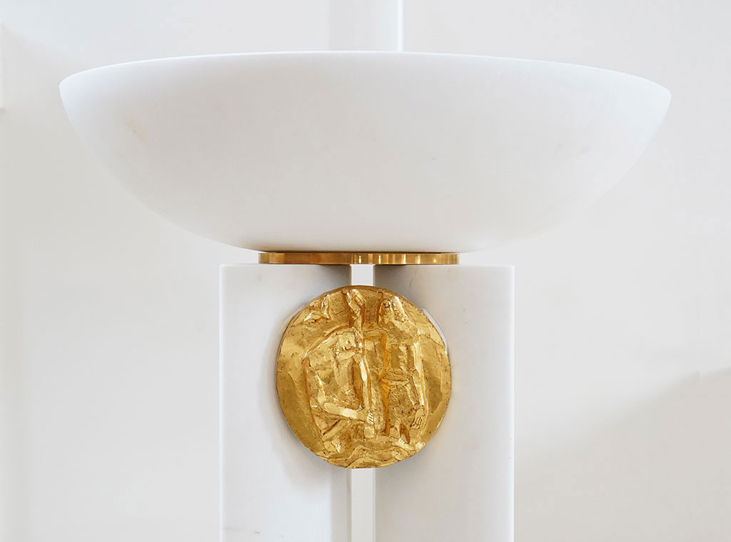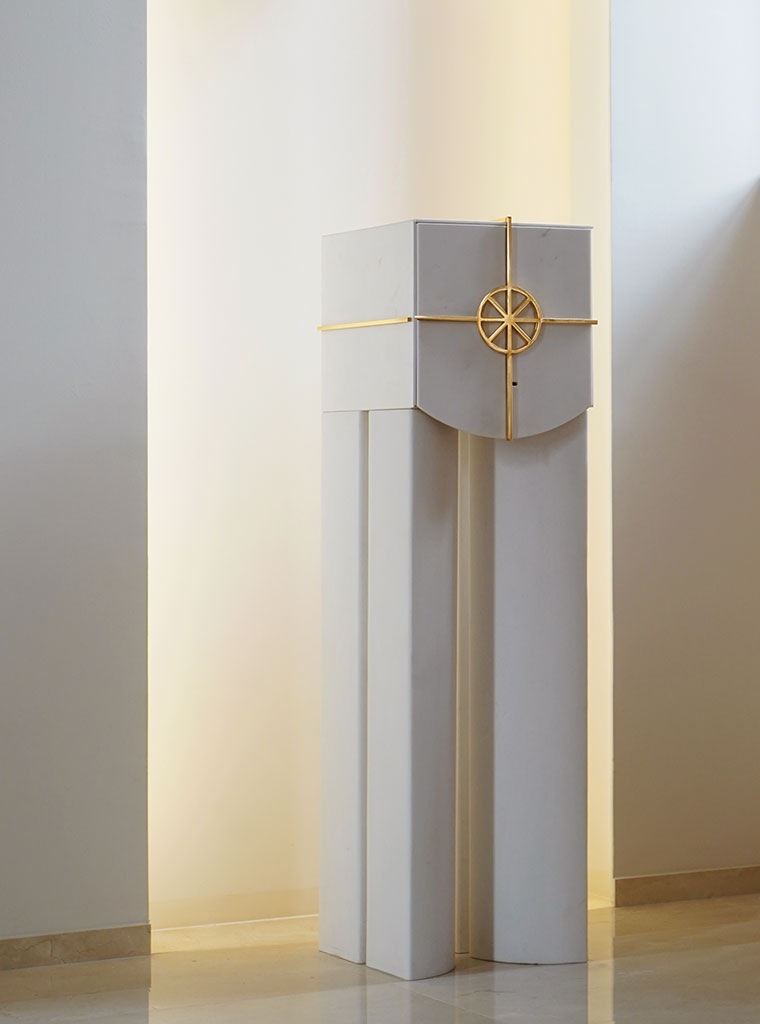 Elementi su posebno dizajnirani i karakterizira ih dvojnost materijala, bijeli kamen predstavlja trajnost i čistoću, a zlato predstavlja plemenitost i uzvišenost. Sastoje se iz četverodijelnog postamenta, oblikovani prema različitim namjenama i simbolikama, u jednostavnom izrazu, oslobođeni svega suvišnog, stvarajući atmosferu prozračnosti, otmjenosti i dostojanstva.