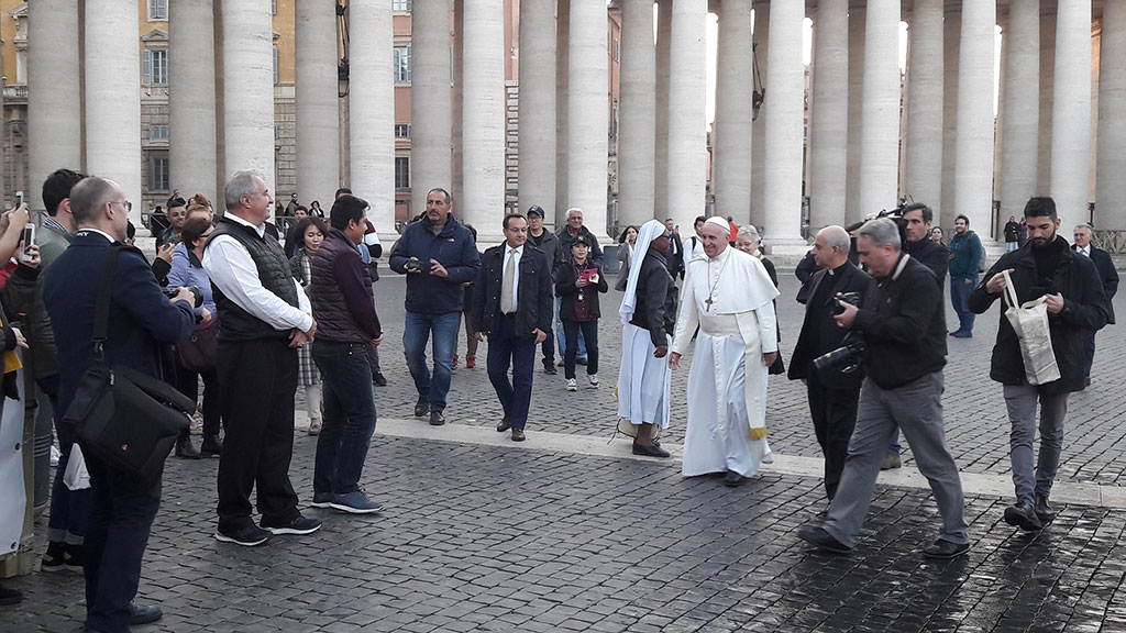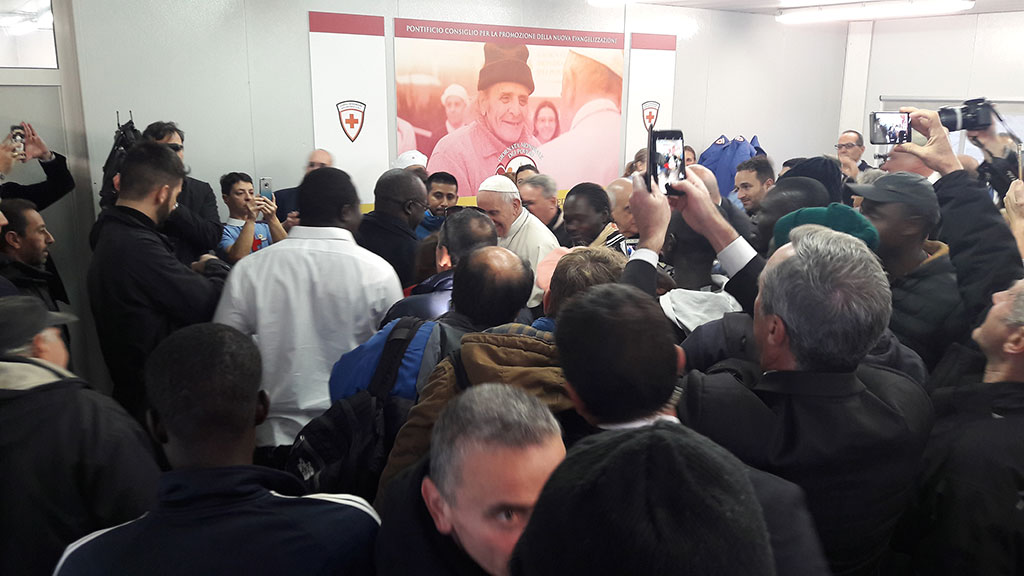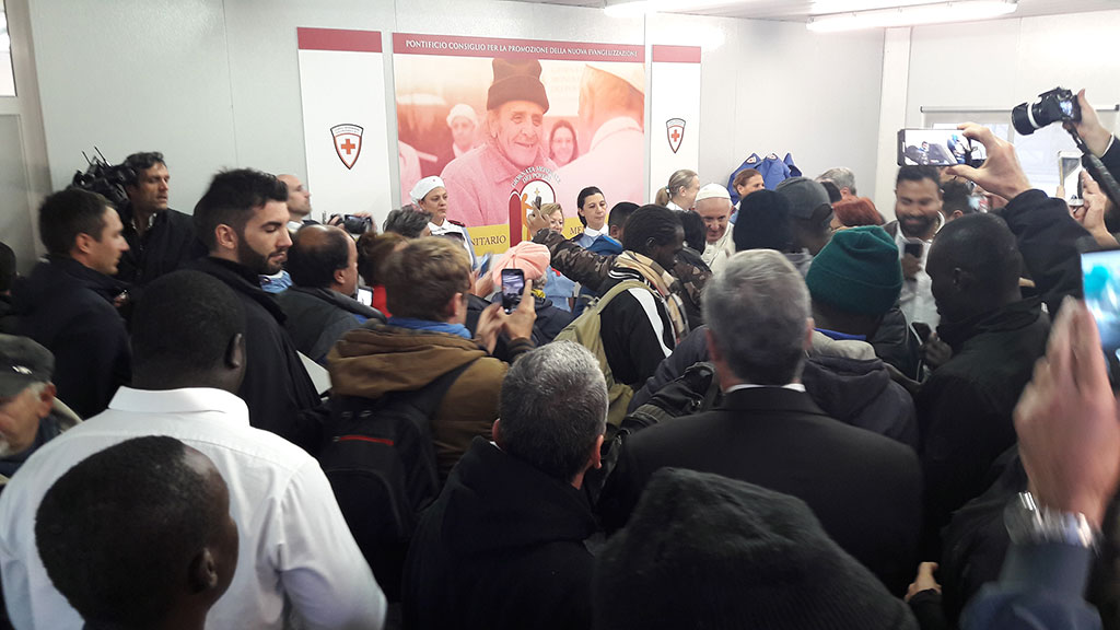 Mnogi turisti koji su se malo iza 16 sati našli na Trgu Sv. Petra ostali su nemalo iznenađeni kada im je u susret došao nitko drugi nego sam Sveti Otac. S nekima od njih se srdačno pozdravio te je nastavio svoj put prema medicinskom garnizonu gdje se susreo s medicinskim radnicima te sa siromašnima koji su tada bili na pregledu. Zatim je obišao sve prostorije u kojima liječnici svaki dan od 8 do 22 sata primaju pacijente.