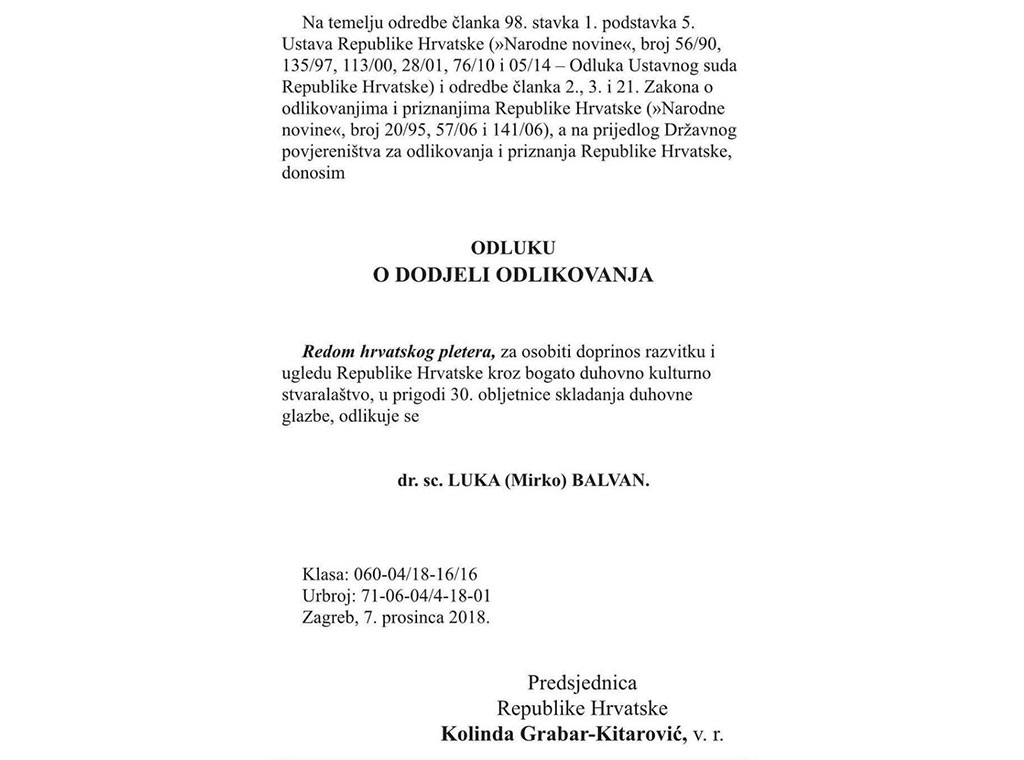 Predsjednica Republike Hrvatske odlikovala je dr. sc. Luku Balvana „Redom hrvatskog pletera“ za osobit doprinos razvitku i ugledu RH kroz bogato duhovno kulturno stvaralaštvo u prigodi 30. obljetnice skladanja duhovne glazbe.